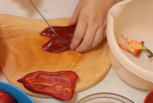 - Operite paprike, uklonite peteljke i seme. Ljutim papričicama odstranite samo peteljke. Oljuštite beli luk. Sameljite paprike, ljute papričice i beli luk.