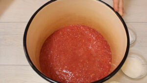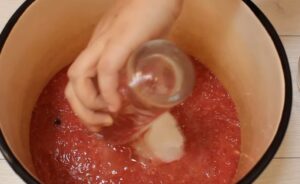 - Sipajte samleven paradajz u veliki lonac, dodajte ulje, so, šećer i sirće. Stavite na srednju vatru da lagano krčka oko 50 minuta uz povremeno mešanje.