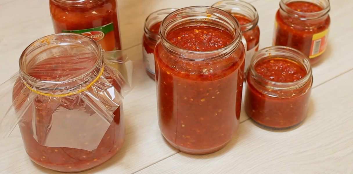 - Uklonite lonac s vatre. Po želji dodajte konzervans i dobro promešajte. Vruću ljutenicu sipajte u vruće tegle koristiteći levak.