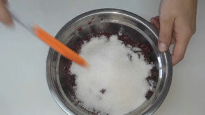 - U činiji pomešajte višnje, griz i 8 kašika šećera. Ostavite 5 –10 minuta da griz veže sok.