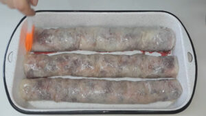 - Ponovite slaganje dok ne potrošite sav materijal. Trebalo bi da dobijete između 3 i 6 rolnica. Gornje strane rolnica tanko premažite prelivom.