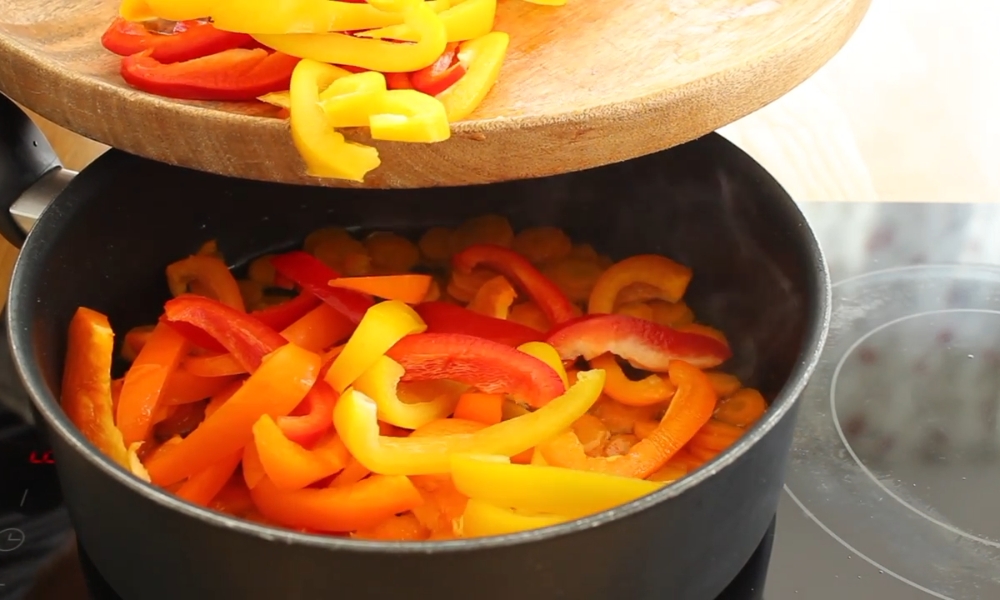 Baza su paprika, paradajz i luk, dinstani strpljivo dok povrće ne pusti sokove i ne zadrži sočnu, ali ne vodenastu konzistenciju.